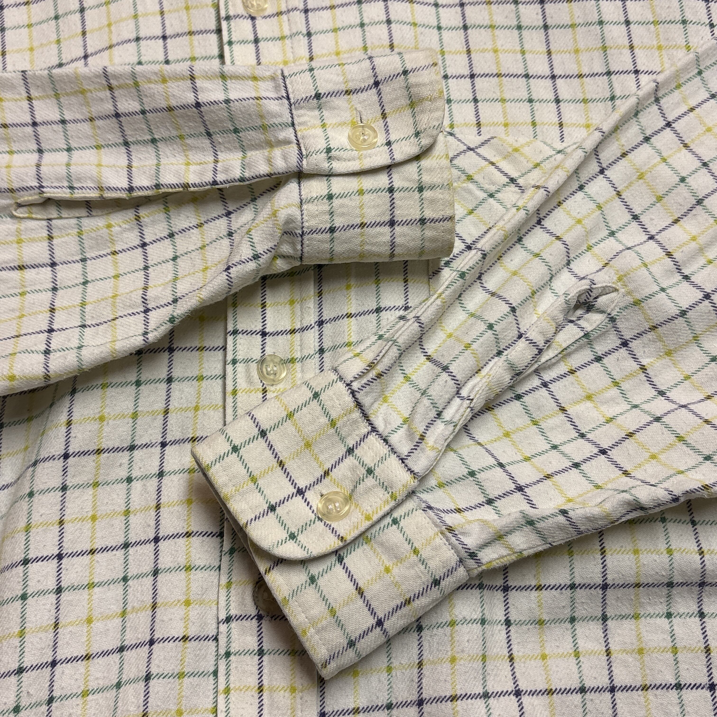 白地にイエロー×ネイビー×グリーンのチェック柄。