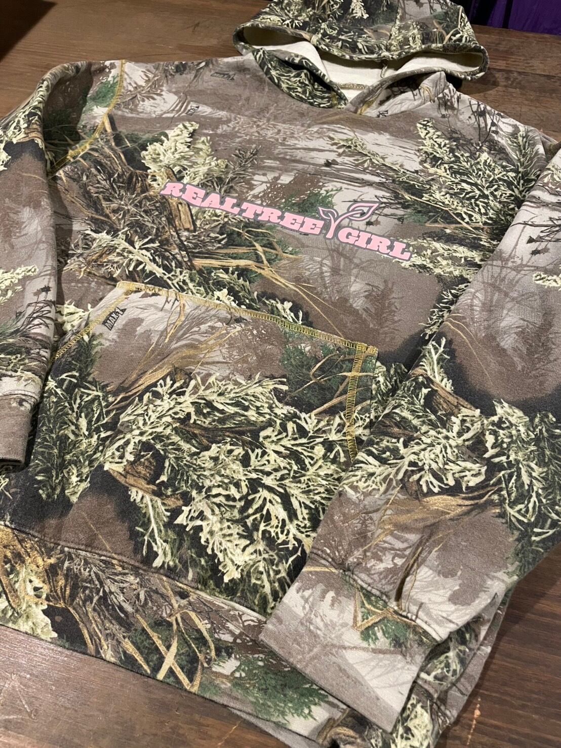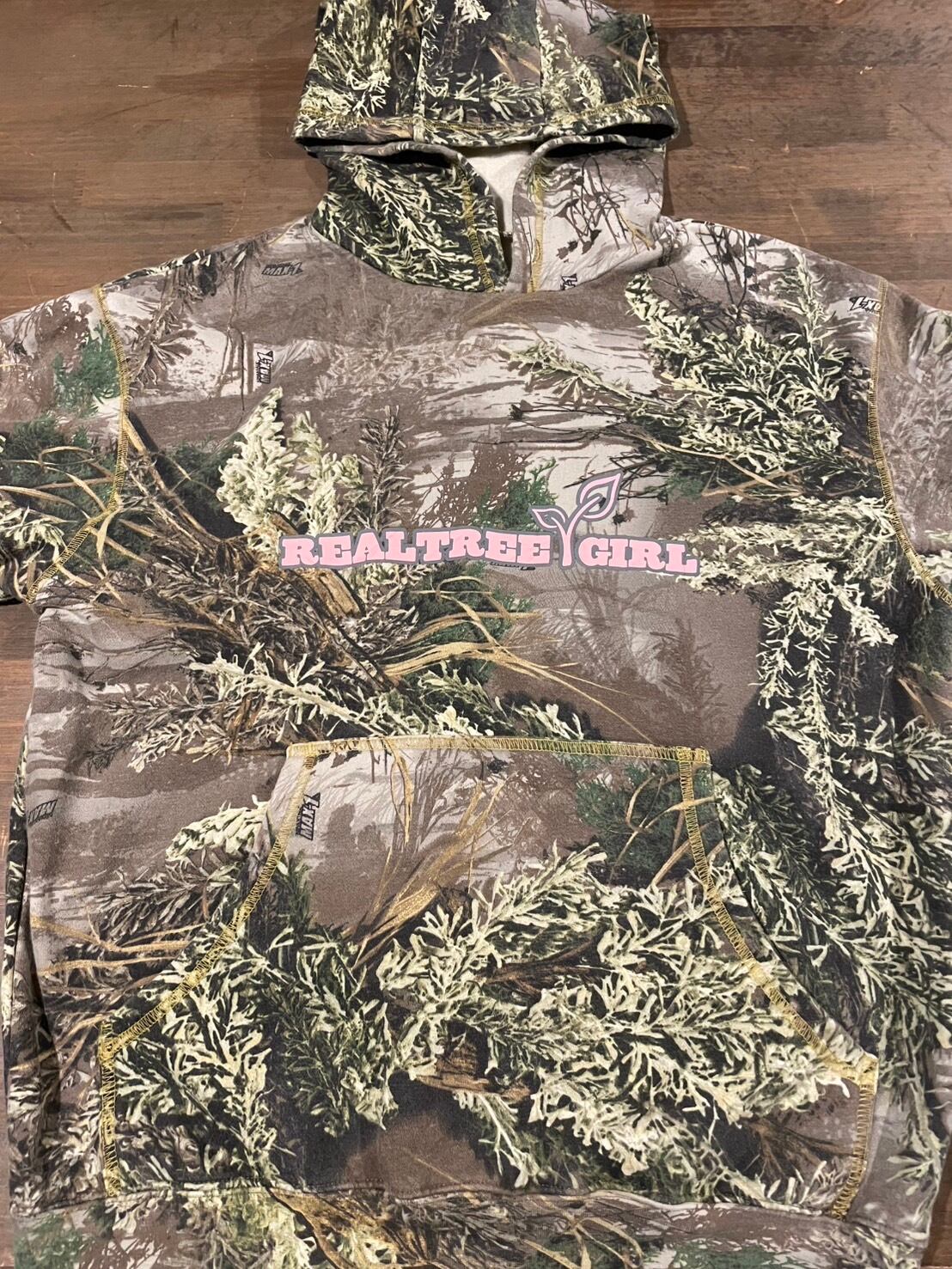 「REALTREE GIRL」のリアルツリー柄が印象的なプルオーバーパーカー。アウトドアシーンやカジュアルな日常にぴったりな一着です。